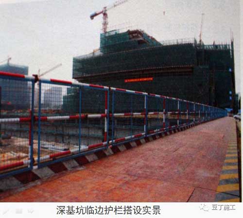 (1)基坑临边防护一般采用钢管搭设两道防护栏杆形式(下道栏杆离地600mm,上道栏杆离地1200mm),立杆间距应不超过2000mm,立杆与基坑边坡的距离不应小于500mm